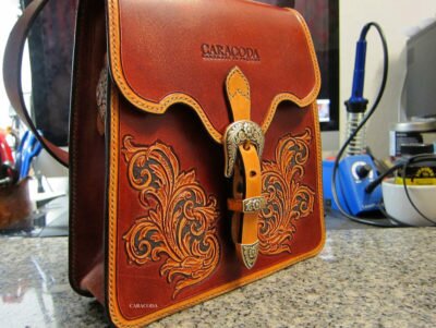 Мне очень нравится работать с кожей растительного дубления. Кусок такой кожи привлекательный уже сам по себе, а если его покрасить, нанести тиснение – и сравнить не с чем. Я люблю шить из кожи сумки и чемоданы. И в этом мастер-классе постараюсь рассказать о том, как делаю одну из своих сумок с тиснением.